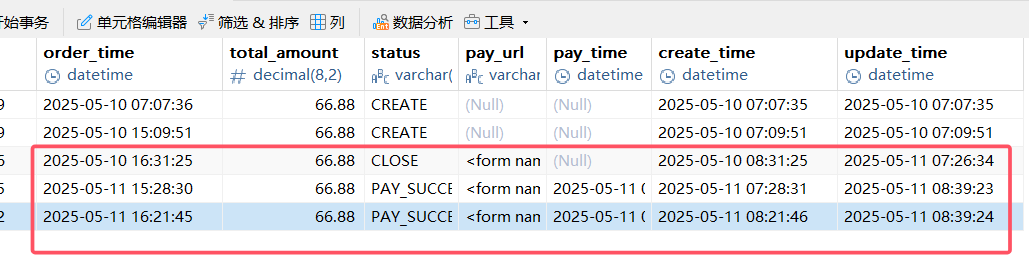 业务逻辑:创建订单或更新订单状态时,通过 mapper、xml 运行 SQL 语句,对象的 order_time 和 create_time、update_time 字段的时间不一致。create_time、update_time 都是 now(),但 order_time 是 Java 库的 new Date()。