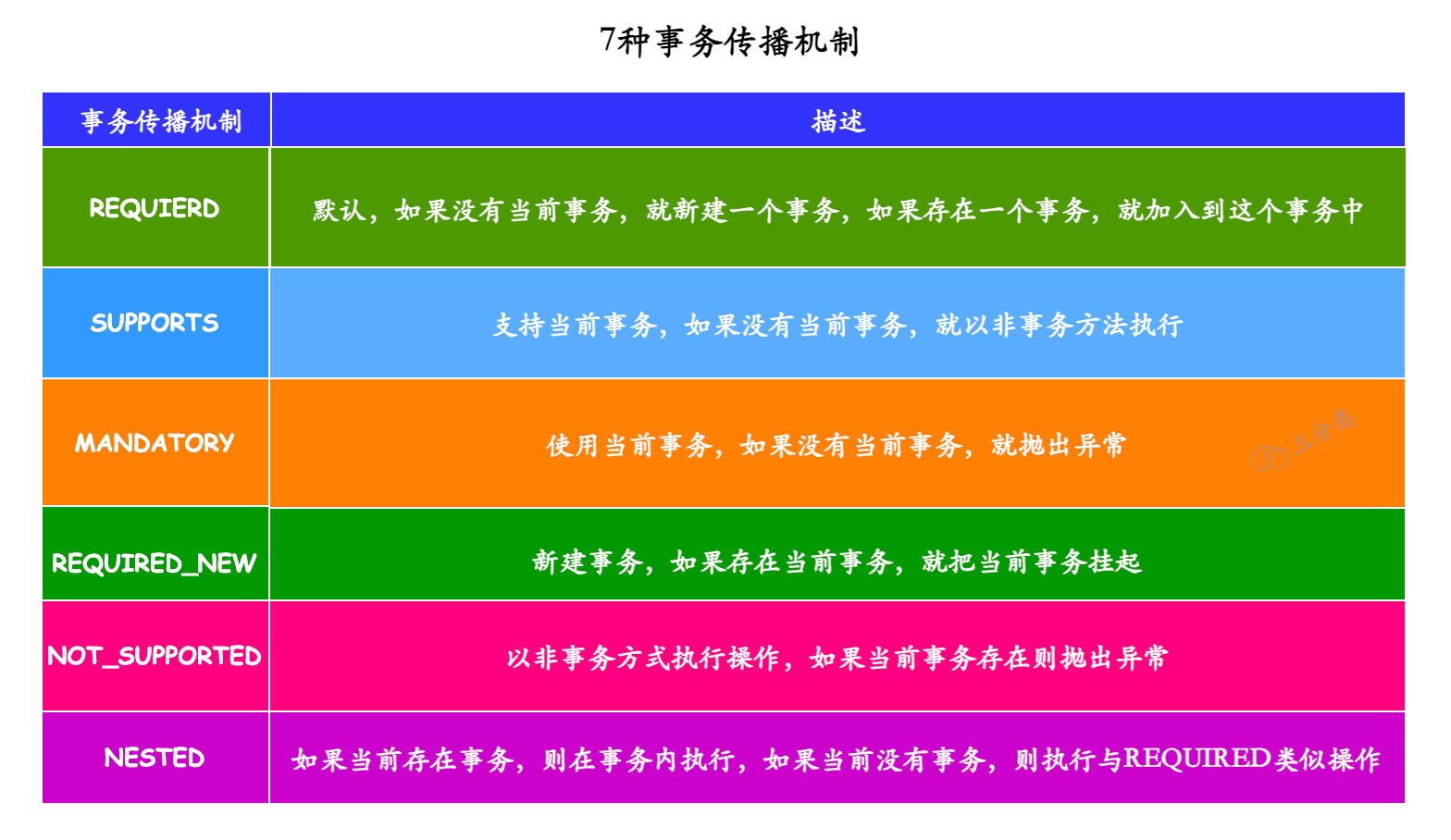 最后还有一个比较特殊的 NESTED,嵌套事务。它有点像 REQUIRES_NEW,但又不完全一样。NESTED 是父事务的一个子事务,父事务回滚,它肯定也得回滚。但它自己回滚,却不会影响到父事务。这个特性在处理一些批量操作,希望能部分回滚的场景下特别有用。不过它需要数据库支持 Savepoint 功能,如 MySQL。